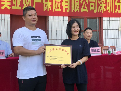 美亞財產保險有限公司深圳分公司客服部經理張亞琴向譚村小學贈送“綠色愛心電腦教室”牌匾,譚村小學梁春滿校長接收牌匾。