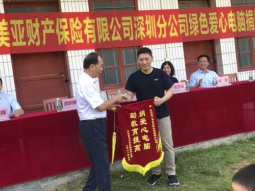 廣東省教育基金會鄭熾欽副理事長兼秘書長向美亞財產保險有限公司深圳分公司贈送錦旗,美亞財產保險有限公司深圳分公司王希立總經理接收錦旗
