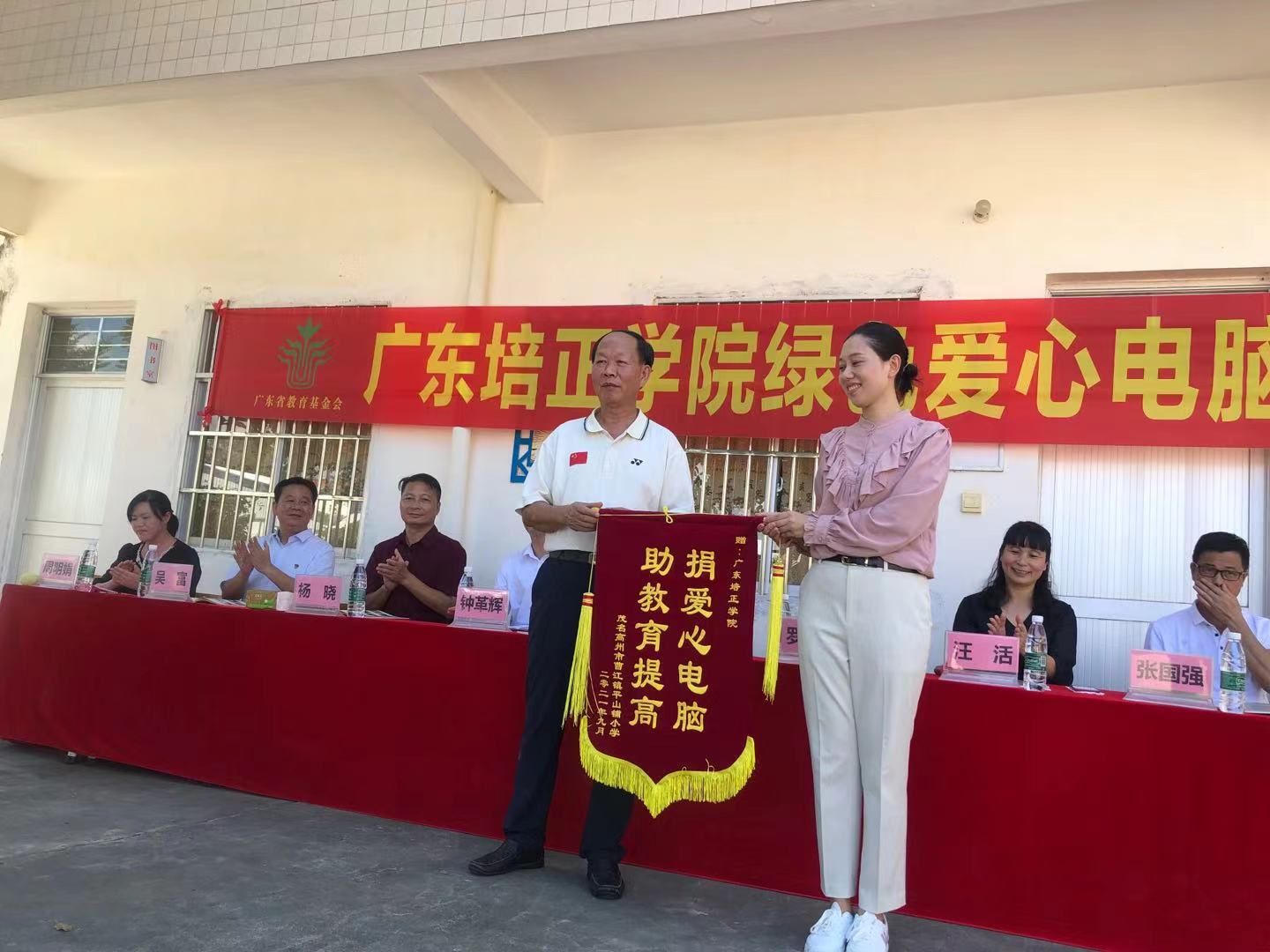 廣東省教育基金會鄭熾欽副理事長兼秘書長向廣東培正學(xué)院贈送錦旗,請廣東培正學(xué)院資產(chǎn)管理辦公室資產(chǎn)管理員羅慧接收錦旗。