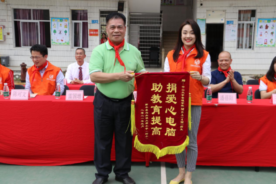 廣東省教育基金會雷國增副秘書長向中山大學管理學院MBA聯合會贈送錦旗,中山大學管理學院MBA聯合會吳璇副主席接收錦旗。